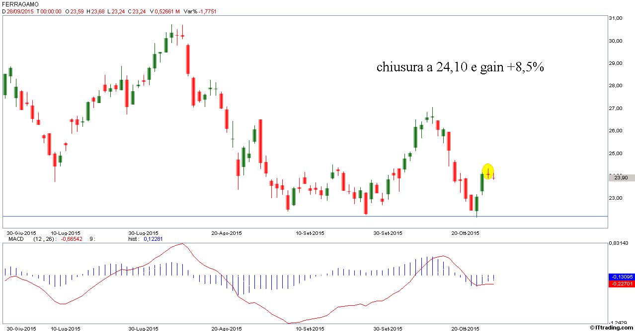 Ferragamo presenta in data 21 Ottobre 2015 una interessante situazione grafica che permette di impostare un ordine pending buy: siamo molto probabilmente a chiusura del ciclo in corso, e vicini al supporto statico di lungo periodo, e al supporto dinamico che funge da base del canale discendente: