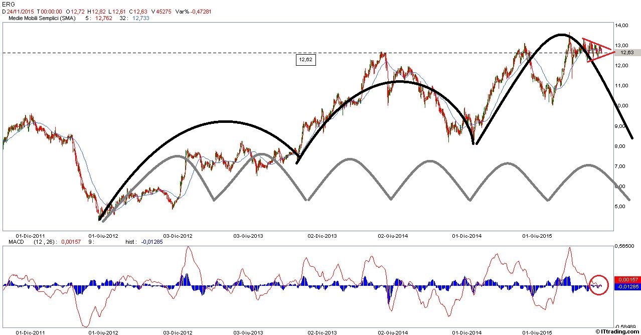 Il titolo Erg presenta una situazione grafica interessante: presenta cicli di lungo periodo molto regolari, e quello attuale evidenzia uno stallo dei prezzi che sembra voglia sbloccarsi puntando al basso, il prezzo infatti da varie sessioni dopo un lungo up trend è in una fase di trading range e la rottura dei 12,50 euro potrebbe dare il via all’accelerazione ribassista.