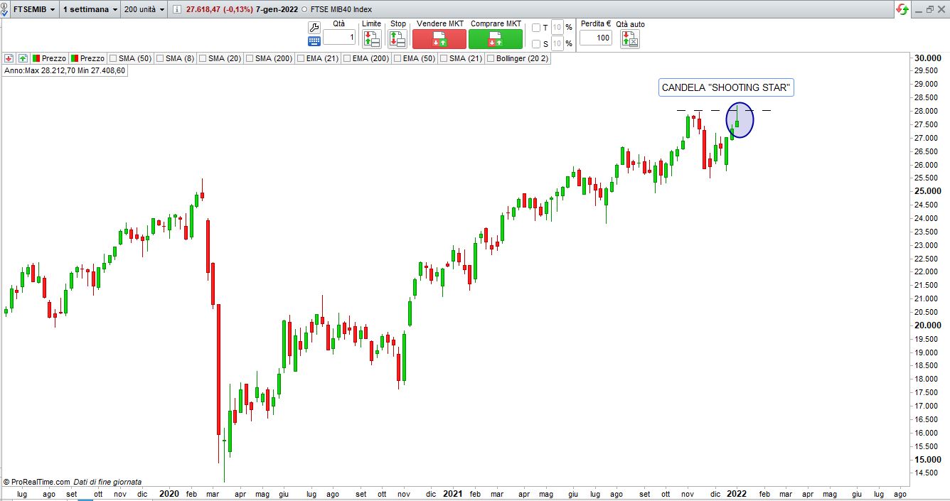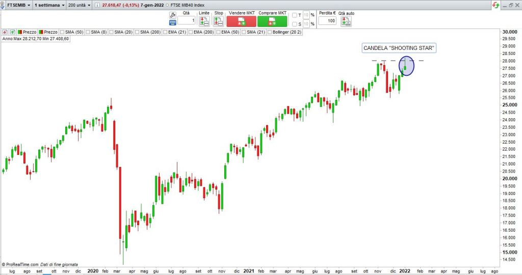 La settimana si è chiusa con un segnale di breve ribassista se guardiamo l’ultima candela che rappresenta proprio l’ultima ottava di borsa: