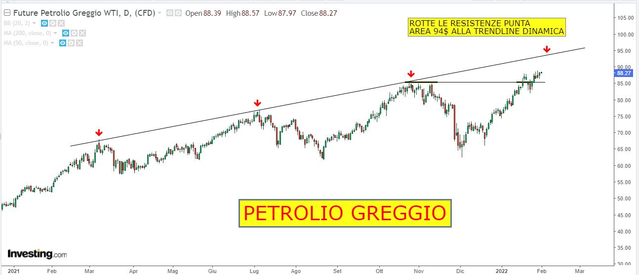 ancora un giorno di rimbalzo per la Borsa Italiana insieme alle “sorelle” del Vecchio Continente, mentre scriviamo Wall Street galleggia sulla parità, l’Oro tocca ancora i 1800 $ mentre il Petrolio sembra puntare ai 90 $ per barile, non crediamo che si faranno sull’azionario nuovi massimi ma al contempo la risalita dei listini potrebbe proseguire ancora per qualche sessione, i timori della pandemia e dell’inflazione sono per ora in secondo piano.