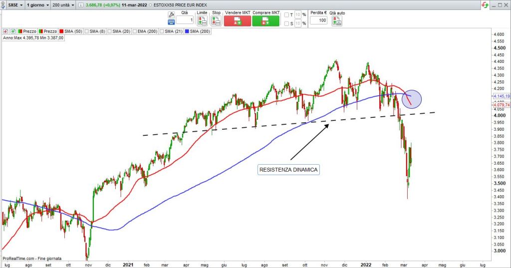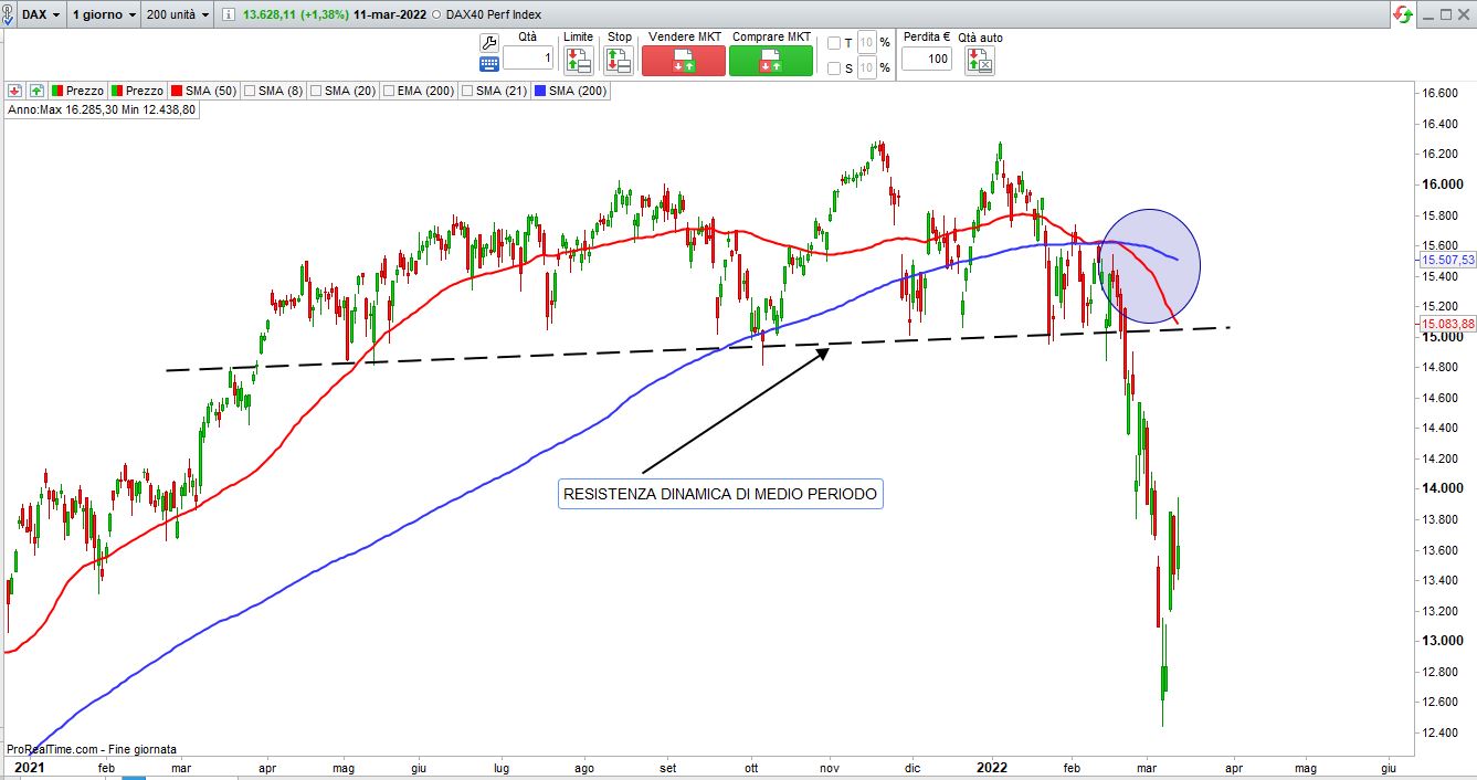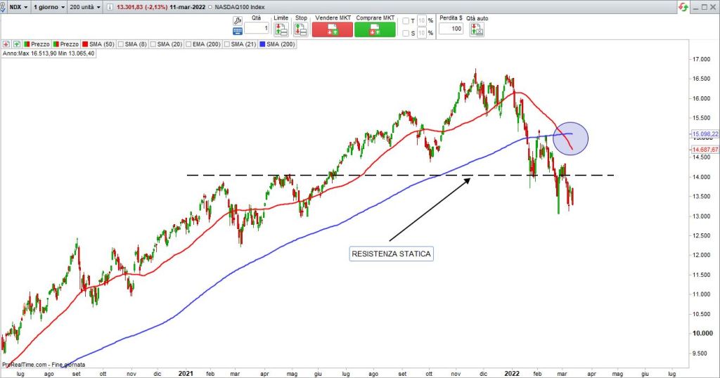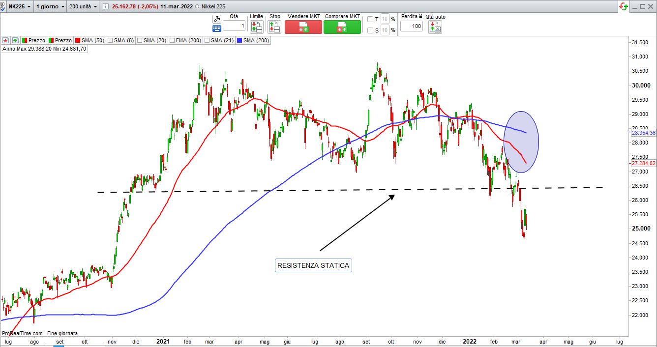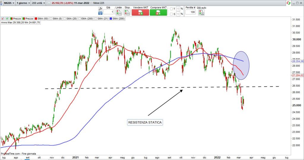 Statisticamente questo incrocio appare prima di un cambio di trend da rialzista a ribassista che rischia di essere duraturo, come possiamo vedere nei grafici a seguire del Dax, del Nasdaq100, dell’ Eurostoxx50 e del Nikki225 il prezzo è già sceso in modo ripido e ora si trova anche sotto a delle resistenze evidenti e importanti; a meno di un repentino cambiamento del sentiment degli investitori, si preannuncia un 2022 davvero non facile per i listini mondiali.