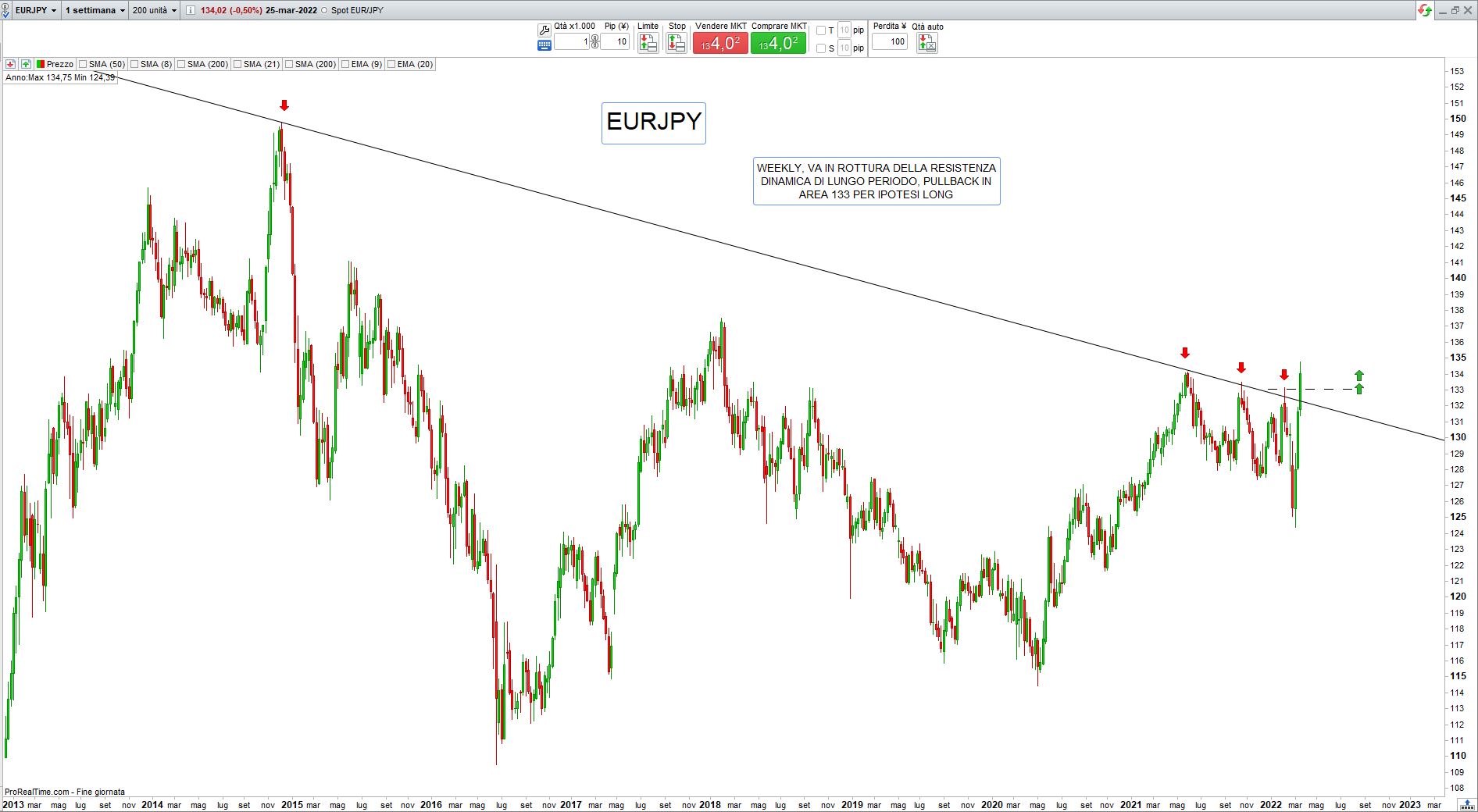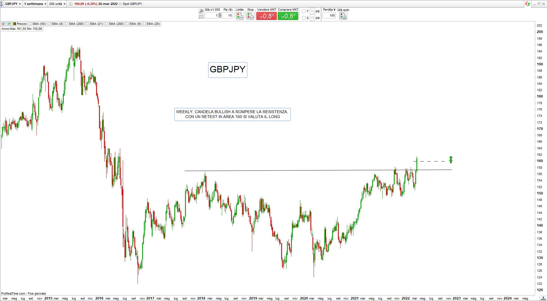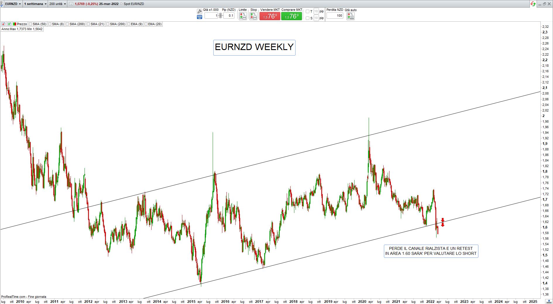 Per l’analisi tecnica sui grafici di borsa abbiamo utilizzato il timeframe weekly con il quale si evidenziano in alcune coppie molto chiaramente dei livelli importanti da monitorare per cogliere delle buone opportunità di trading di breve ma anche di medio periodo, vediamole insieme: