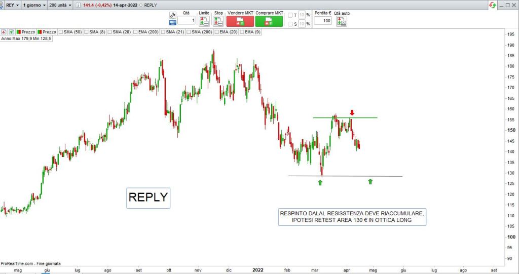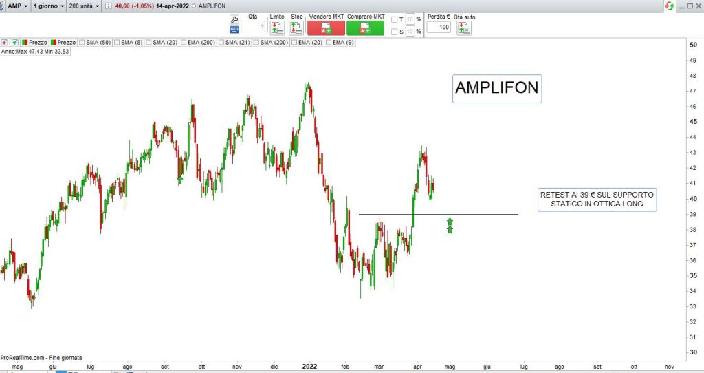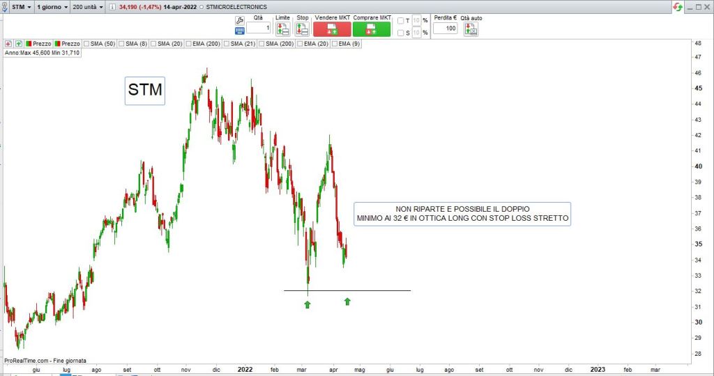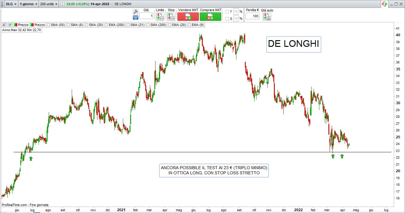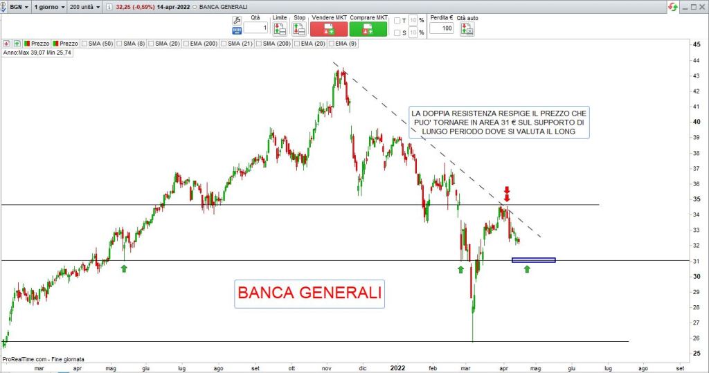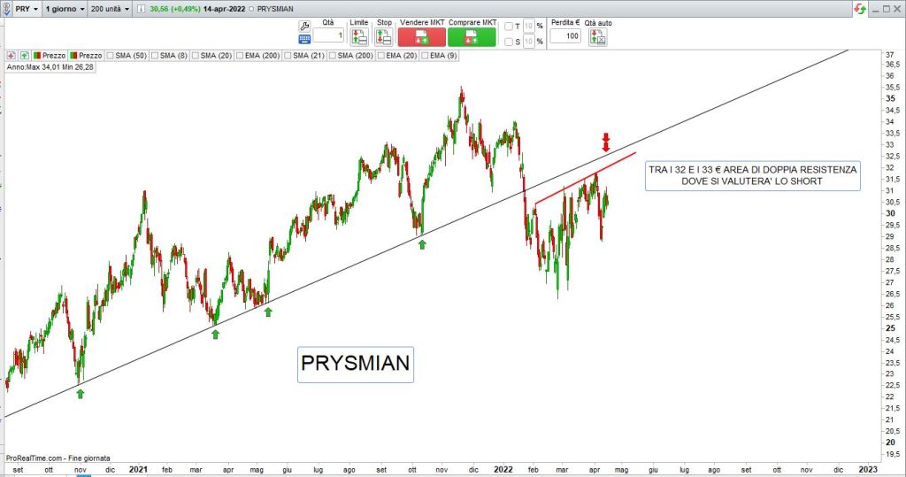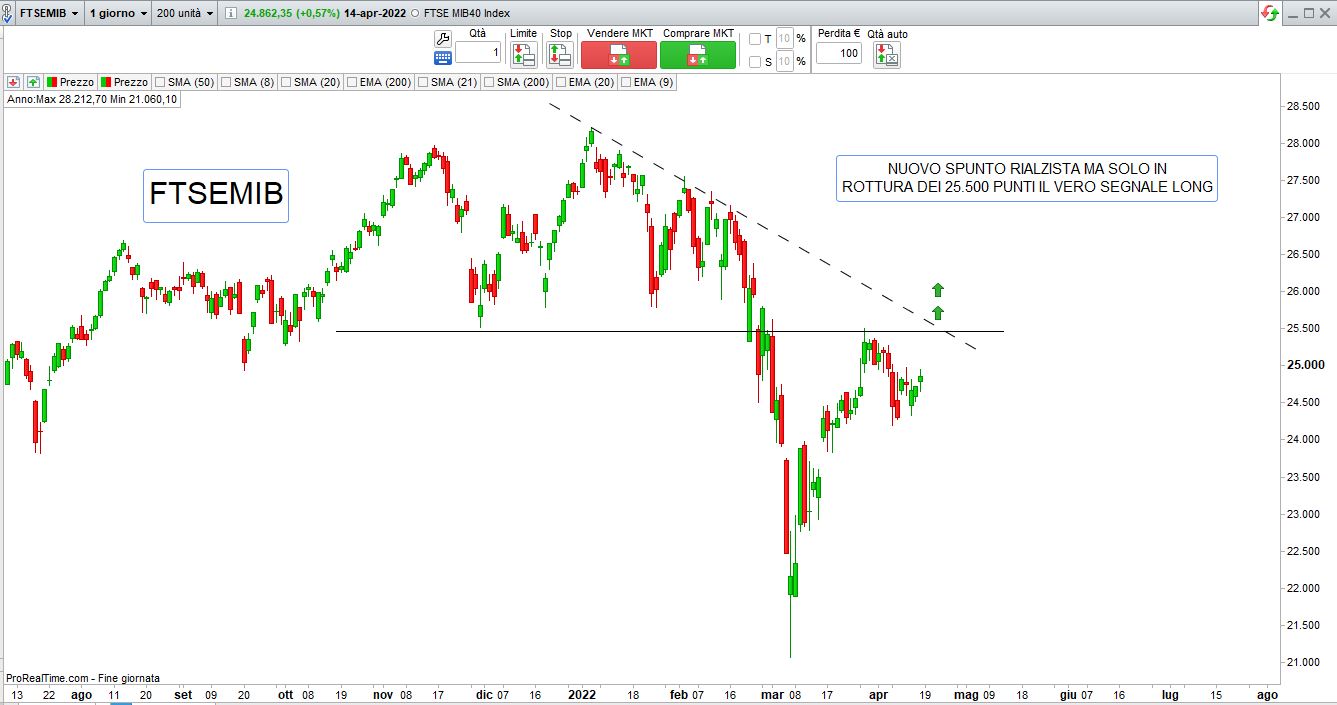 Salve a tutti e naturalmente Buona Pasqua, domani la Borsa Italiana sarà chiusa e ne approfittiamo per analizzare alcune azioni del Ftsemib (ma non solo) cercando spunti operativi di trading di breve e medio periodo; sullo sfondo i temi che dettano legge sono i soliti: le tensioni derivanti dallo stato di guerra tra Russia e Ucraina e il rialzo dei tassi che in Europa, nonostante le parole della Lagarde, è secondo noi quasi alle porte.