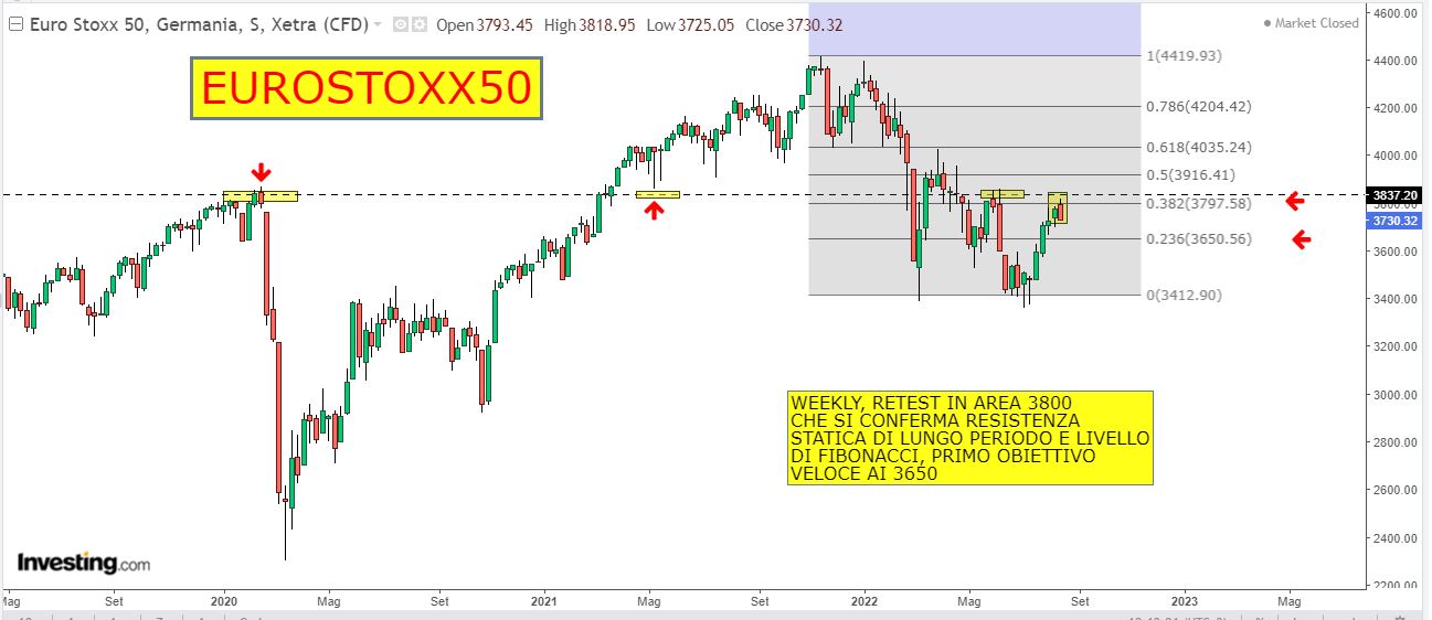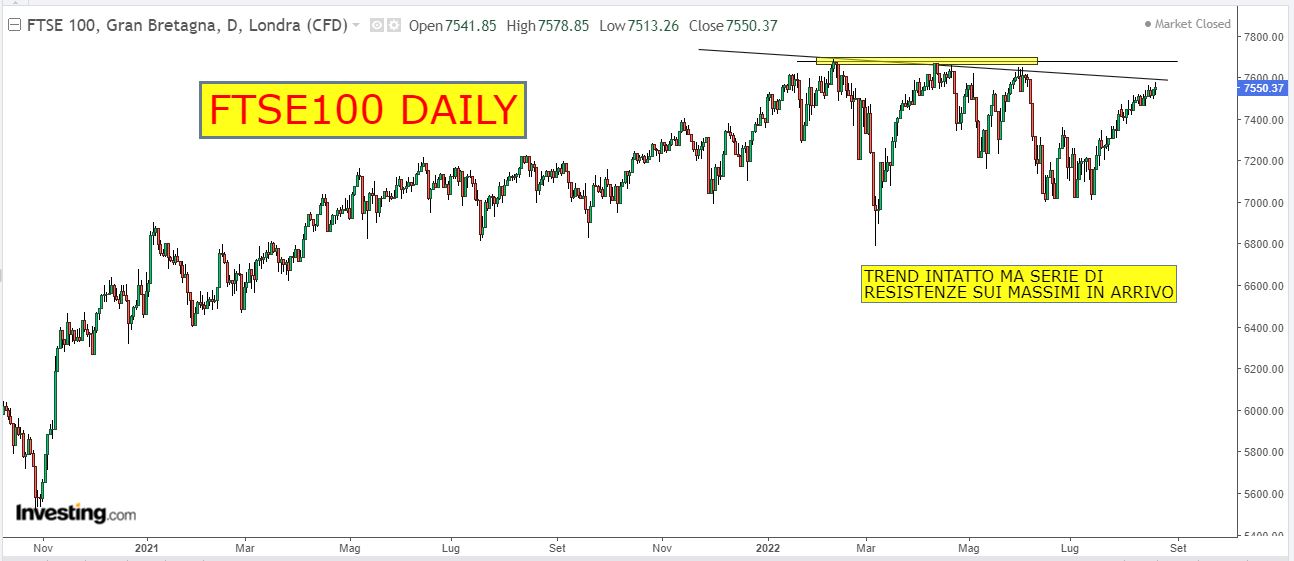 Questo offre una situazione grafica degli indici pressoché uguale per molti di essi e lascia presagire uno storno alle porte, non è semplice decifrare se sarà una presa di beneficio breve o se lo spauracchio della recessione avrà la meglio e riporterà le Borse sotto i recenti minimi.