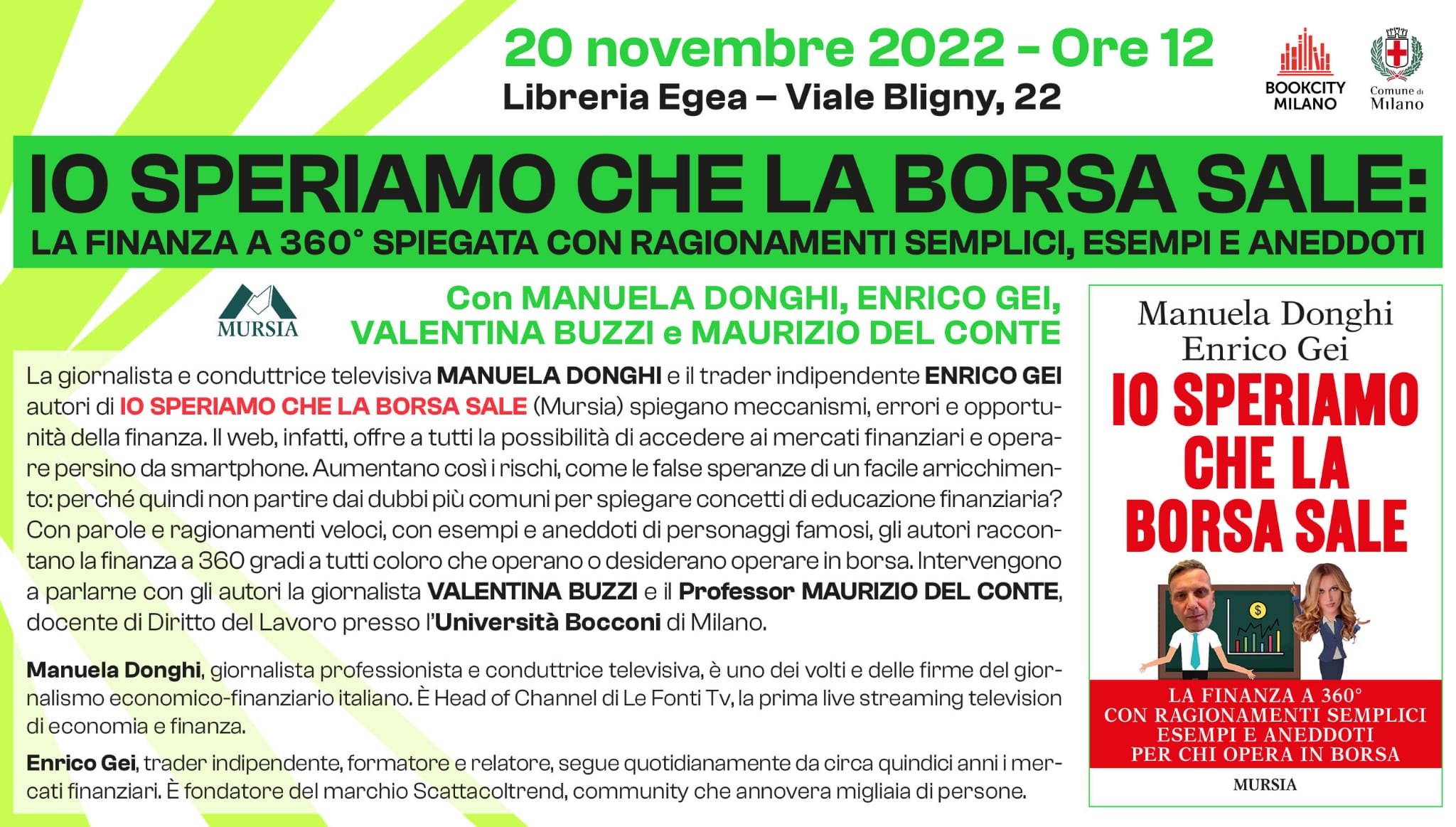 “Io speriamo che la borsa sale” torna a Milano Domenica 20 Novembre alle 12: con Manuela Donghi vi aspettiamo alla Libreria Egea in viale Bligny 22 (Bocconi); interverrà il professor Maurizio Del Conte, docente di Diritto del Lavoro e modererà l’evento la giornalista Valentina Buzzi.