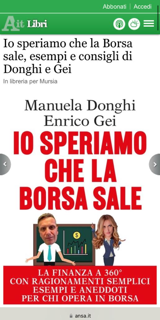 “Io speriamo che la Borsa sale” con Manuela Donghi per Mursia Editore sta riscuotendo successo tra gli appassionati di Borsa e Finanza: aneddoti, storie, le vite dei miti della Borsa, metodi operativi per iniziare a fare trading e tanti altri argomenti sono apprezzati dai tanti lettori che ringraziamo infinitamente. Ora è possibile continuare la lettura dei nuovi argomenti sul canale Telegram del libro!