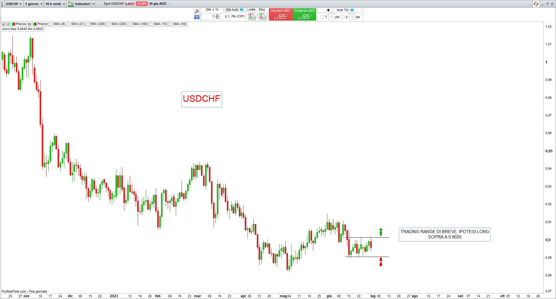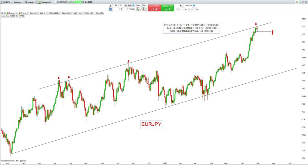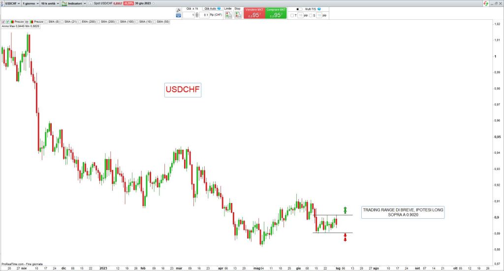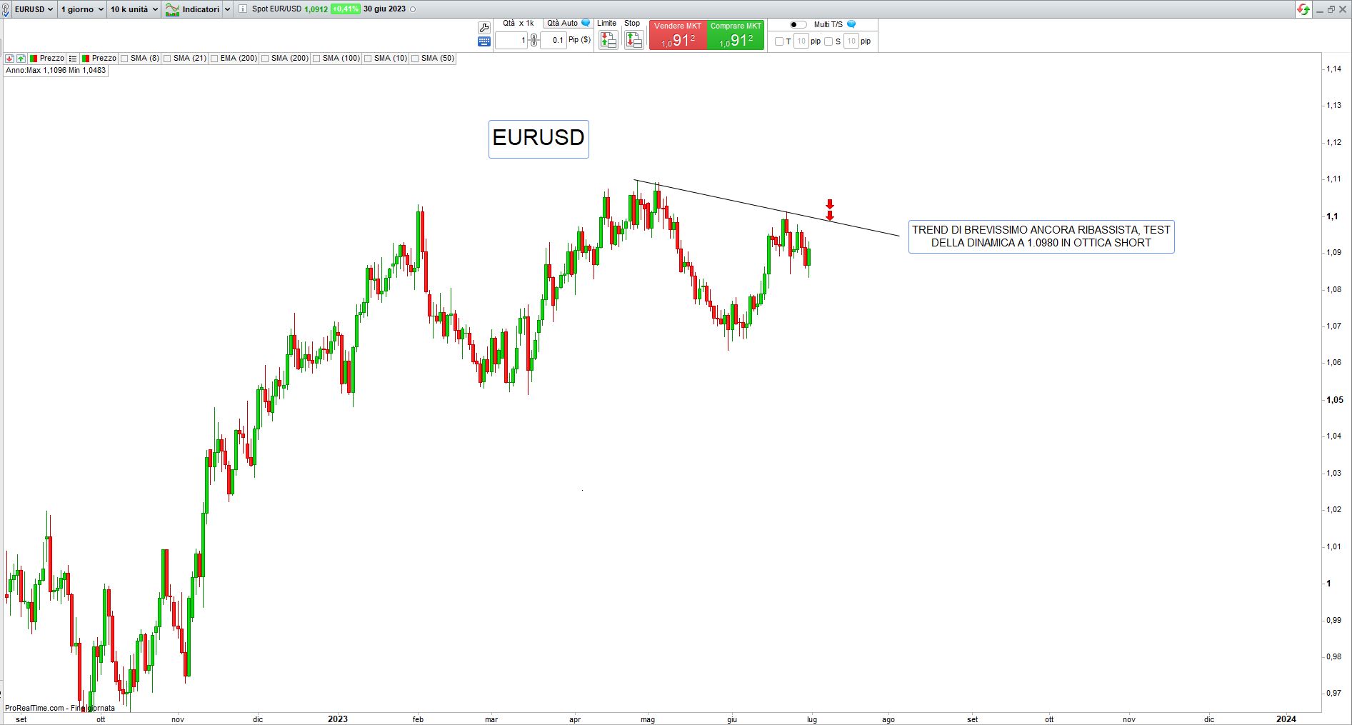 mercati valutari senza particolari scossoni nell’ottava di Borsa passata, la coppia EurUsd non mostra chiara direzionalità nel brevissimo e area 1.11 per ora sembra una solida resistenza, in attesa di nuove mosse ( o comunicazioni…) da parte della Bce e della Fed, nelle ultime sessioni abbiamo assistito a qualche spunto rialzista grazie alla conferma del nuovo rialzo dei tassi annunciato dalla Lagarde per il mese di Luglio, il tutto mentre l’inflazione inizia a dare timidi cenni di rallentamento, buoni i dati ad esempio in Spagna che ha visto un aumento dei prezzi dell’1,9%.