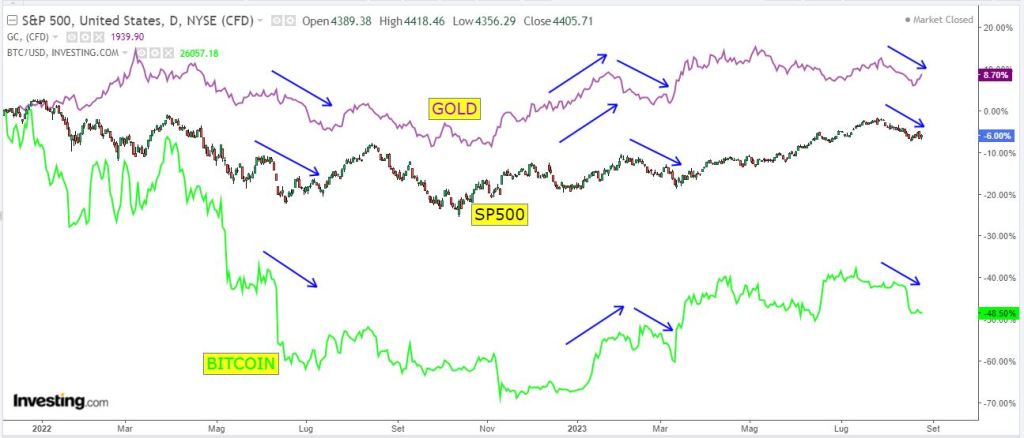 Più e più volte si è voluto indicare l’Oro e ultimamente anche il Bitcoin come beni rifugio, segnali che mostrano la totale lontananza dalla realtà visto che un bene rifugio tende ad apprezzarsi quando l’azionario scende. Ecco come si comportano Il Gold e il Bitcoin raffrontati all’ SP500: