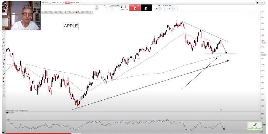 mercati azionari senza chiara direzionalità e in questo fine settimana abbiamo messo al centro dell’attenzione la Borsa di Wall Street con una videoanalisi di molti dei più importanti titoli azionari, tra essi Apple, Amazon, Meta e molti altri; la situazione in Medio Oriente pesa sulle speranze di trader e investitori come un macigno ma ci guida come sempre l’analisi tecnica, per ogni azione abbiamo individuato la fase attuale di trend e le possibili aree di intervento.
