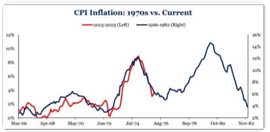 Dopo una discesa, l’inflazione riprese a salire superando il precedente picco (linea blu), e nella fase attuale il movimento (linea rossa) sembra pericolosamente uguale….