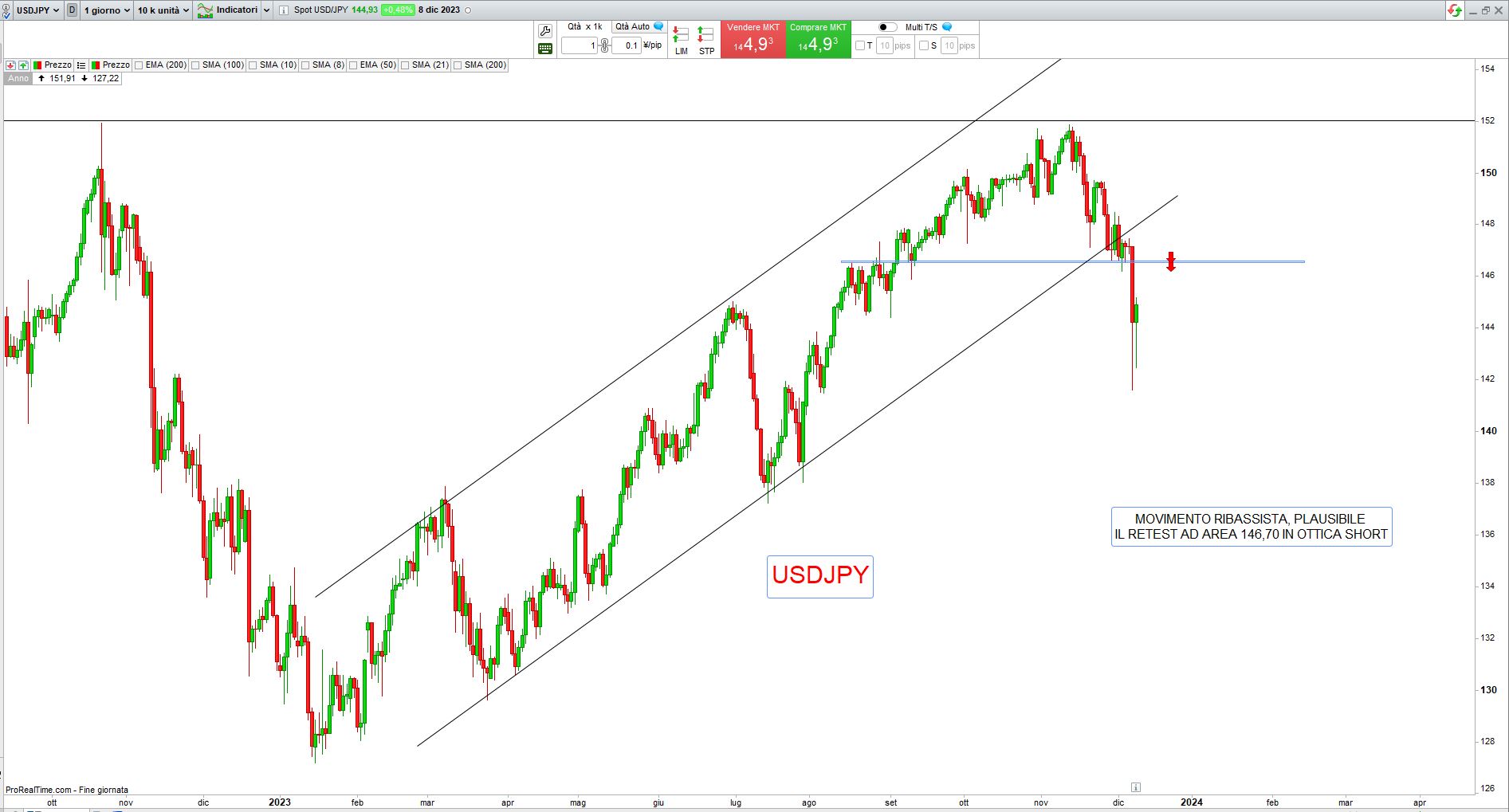 mentre la regina del Forex EurUsd prosegue la sua fase di storno di breve, l’attenzione degli investitori si è spostata sullo yen Giapponese che ha dato importanti cenni di risveglio apprezzandosi contro tutte le altre valute, potrebbe essere al termine la pluriennale fase di tassi a zero decisa dalla Bank of Japan per contrastare l’inflazione, come ha fatto intendere il suo governatore Kazuo Ueda; e mentre il Giappone parla di aumento dei tassi, in Europa e negli Usa le banche centrali forse iniziano a pensare invece a un possibile inizio di tagli, situazione plausibile ma, secondo noi, non con la cadenza e l’ottimismo che leggiamo da più parti: in alcuni casi già si pronosticano 5/6 tagli per il 2024…