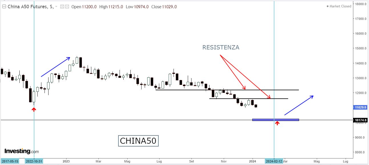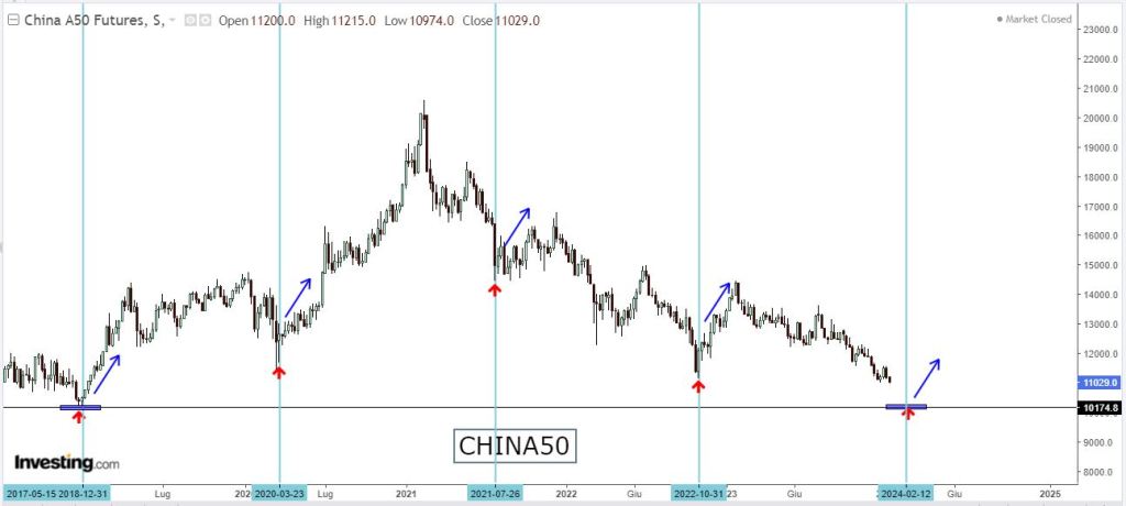 Come nostra abitudine ci rifacciamo all’analisi tecnica e ai crudi numeri e analizziamo il grafico di Borsa dell’indice ChinaA50: