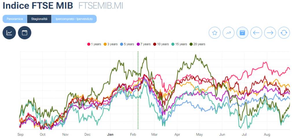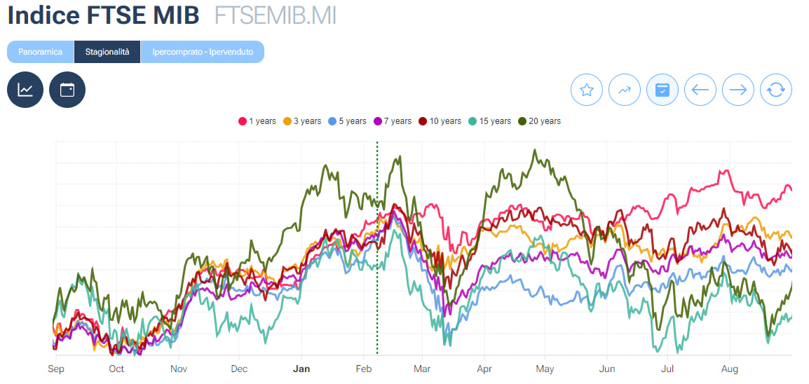 Chiaramente una fase di consolidamento ce la aspettiamo ma ormai l’ostacolo dei 30.000 punti sembra definitivamente superato e anche se statisticamente ci dovrebbe aspettare un mese non brillante come quelli passati, il trend di fondo e il sentiment degli investitori resta ampiamente positivo: negli ultimi 20 anni il Ftsemib ha sempre offerto performances un pò sottotono in questo periodo: