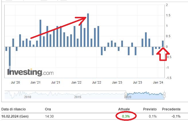 Dopo 3 mesi in negativo il PPI torna positivo alimentando qualche paura sul ritorno dell’inflazione, e sul fatto che la Fed potrebbe ritardare il taglio dei tassi, si noti come fosse “in crescendo” durante il 2021, segnalando un evidente aumento dei prezzi che scatenò la spinta inflazionistica fino a circa metà del 2023.