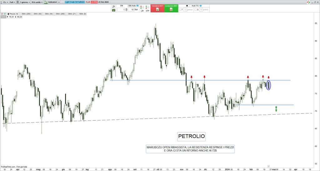 è stata una ottava di Borsa con interessanti spunti per il trading su alcune materie prime, da alcuni giorni i prezzi del petrolio e dell’oro si mantengono stabili. Il greggio ha provato a raggiungere gli 80 dollari al barile in attesa di sviluppi dal fronte geopolitico: nelle ultime sedute sono cresciuti i timori che un taglio delle forniture a seguito dell’intensificarsi degli scontri in Medio Oriente e del conflitto in Ucraina, possa far risalire le quotazioni del greggio.