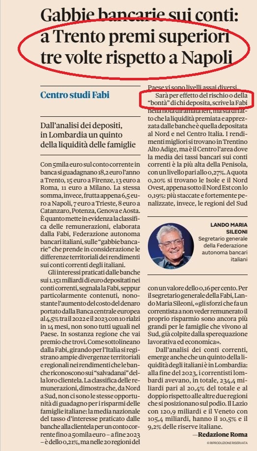 soprattutto ai cittadini di Trento che possono dire che i loro soldi contanti, sudati e depositati in filiale valgono molto di più degli stessi soldi guadagnati all’ombra del Vesuvio, o in altre aree del Centro-Sud, in alcuni casi addirittura tre volte tanto: gli interessi corrisposti ai correntisti variano infatti in maniera oscena da regione a regione e l’articolo del Sole24Ore di oggi parla di gabbie, richiamando le gabbie salariali che più volte la politica nostrana nei decenni scorsi paventò per tentare di calmierare alcuni eccessi inflazionistici.