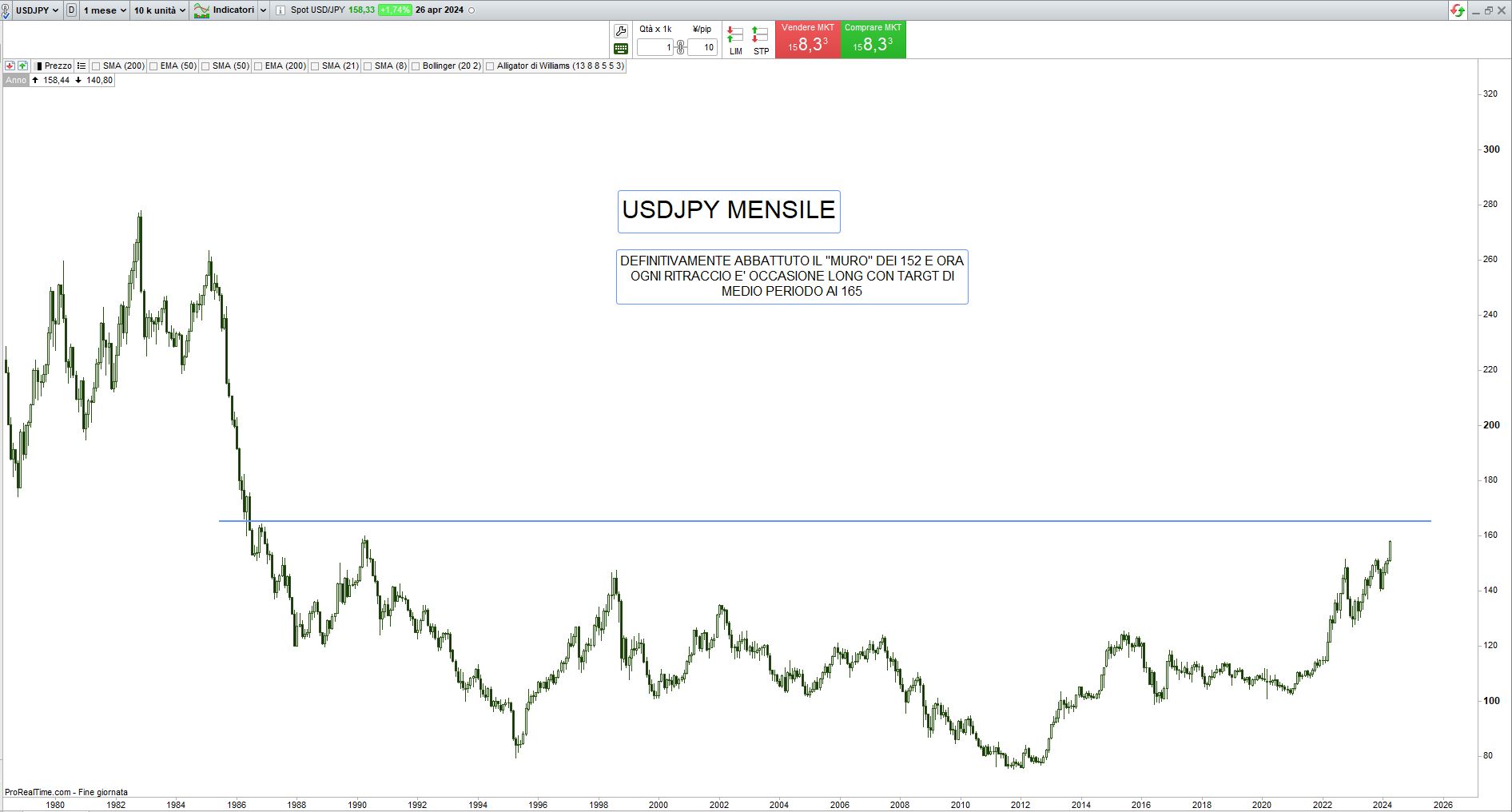Ora che quel muro dei 152 è stato sgretolato, perché nessuno parla di analisi e pronostici non corretti? Perché nessuno scrive “non credevo lo Yen si indebolisse ancora?” D’altronde esporsi non è il loro mestiere, giustificarsi e incassare, (spesso fuori italia) quello invece lo sanno fare, come sanno bannare qualche giovane trader che brucia i conti per le profezie da straccioni che questi straccioni con le tasche gonfie promulgano.