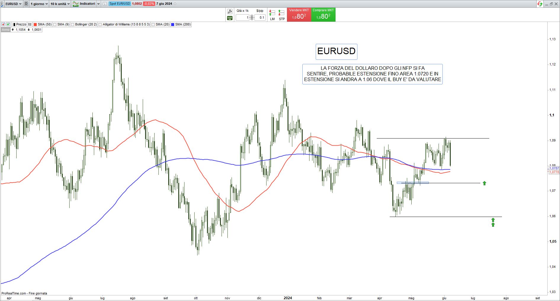 chiusura col botto della settimana di Borsa per quanto concerne i mercati valutari: il Dollaro Usa mostra i muscoli dopo i dati a sorpresa del mercato del lavoro statunitense che vedono nuove buste paga del settore non agricolo (nfp – Non Farm Payrolls): il rapporto sull’occupazione degli Stati Uniti di maggio ha portato un’esplosione di nuove assunzioni, così come un aumento delle retribuzioni orarie medie più caldo del previsto, nonostante un aumento sorprendente della disoccupazione al suo livello più alto dall’inizio del 2022, i non farm payrolls sono aumentati di un incredibile + 272k a maggio, nettamente al di sopra delle aspettative del consenso per un aumento di + 180k, trovandosi anche appena al di sopra dell’intervallo previsto, da + 120k a + 258k.