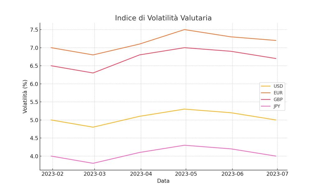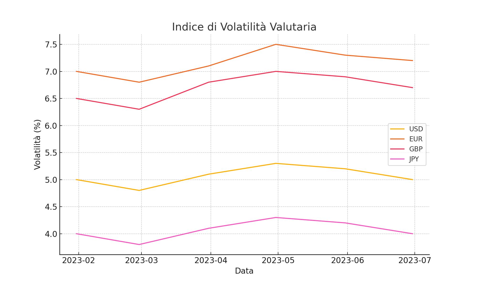 Il secondo grafico confronta la volatilità delle principali valute. Il JPY e l’USD mostrano storicamente una minore volatilità rispetto all’EUR e al GBP, rendendoli potenziali beni rifugio.