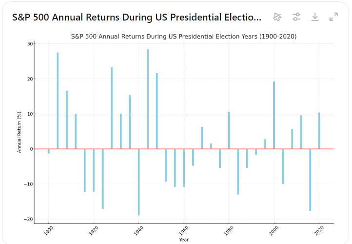 Dal 1900 al 2020, l’indice S&P 500 ha mostrato variazioni significative nei suoi rendimenti annuali durante gli anni delle elezioni presidenziali. La volatilità in questi anni è spesso influenzata dalle incertezze politiche e dalle aspettative degli investitori riguardo ai risultati delle elezioni.