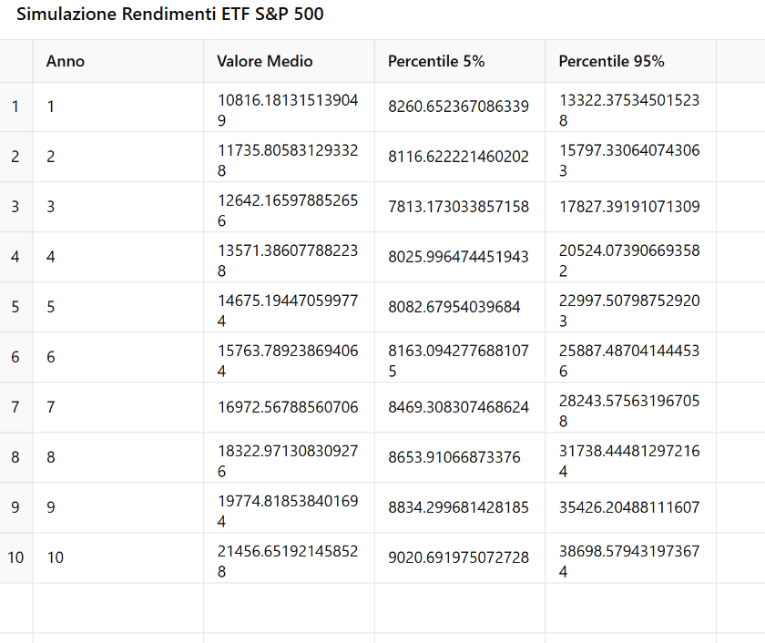 Ho simulato i rendimenti di un investimento iniziale di 10.000€ in un ETF sull’S&P 500 per 10 anni. Puoi vedere i dettagli nella tabella. Qui i risultati principali: