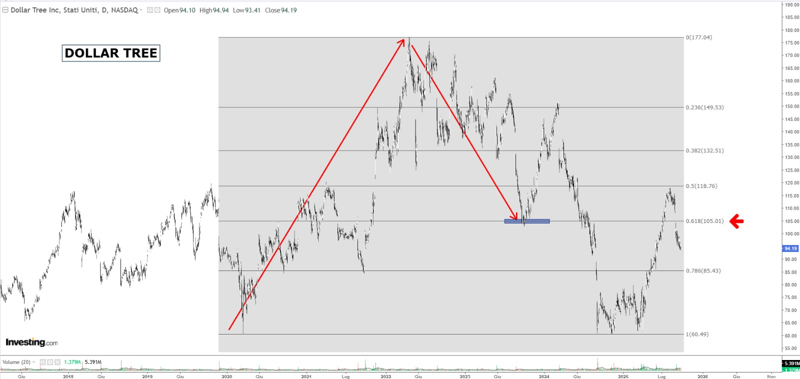 Questa immagine mostra un’analisi tecnica con ritracciamenti di Fibonacci applicata al titolo Dollar Tree (NASDAQ: DLTR).